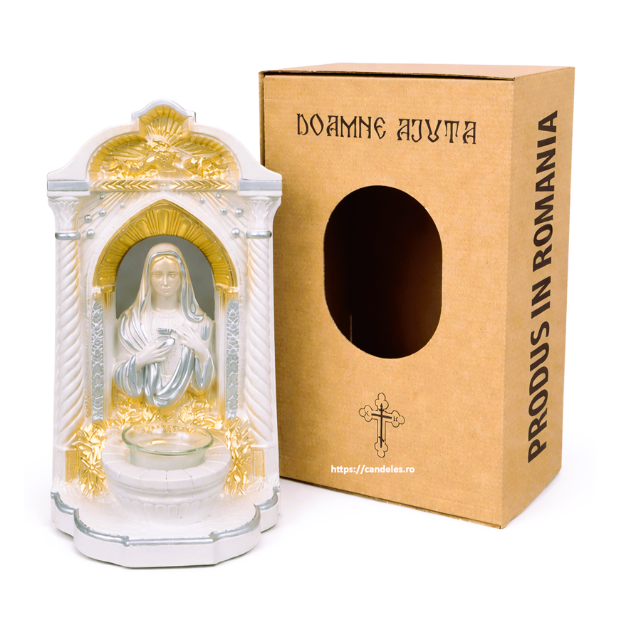 Candela mare alba cu Statueta Maicii Domnului aprinsă este străjerul casei noastre, dar și a sufletului nostru. Pentru toți cei care o aprind cu credință
